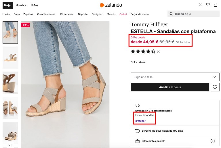 Si aplicas algún descuento, asegúrate de que se vea, como en este ejemplo de Zalando.