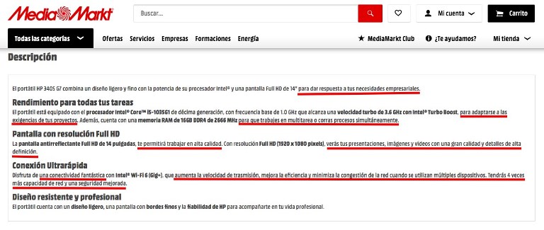 Lo que te acabo de decir es aplicable a cualquier sector, pero lo vas a ver más que claro con este ejemplo de Media Markt, una muestra muy clara de cómo escribir una ficha de producto destacando sus beneficios.