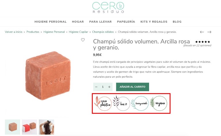 Este champú del ecommerce Cero Residuo, por ejemplo. Parece ser que deja el pelo estupendo. Y lo explica maravillosamente en su descripción. Destaca los beneficios del producto y deja clarísimo por qué deberías usarlo si lo que quieres es volumen. Pero hay algo más que interesa, y mucho, al cliente de esta tienda online.